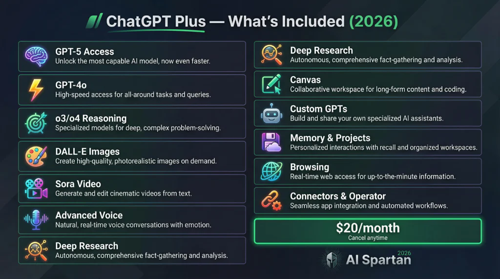 Here’s a comprehensive look at every feature included in your $20/month ChatGPT Plus subscription as of 2026:
