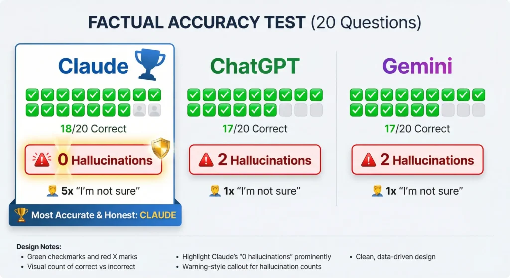 Claude hallucinates the least. In our tests, Claude was the only AI that consistently said “I’m not confident about this” rather than making up information. Anthropic’s focus on AI safety directly contributes to fewer hallucinations.