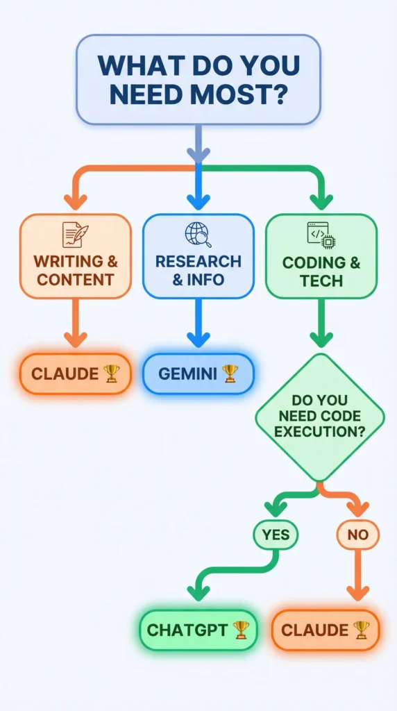 Quick Verdict: If you’re in a hurry — Claude wins for writing and safety, ChatGPT wins for versatility and coding, and Gemini wins for research and Google integration. But the full picture is way more nuanced. Keep reading.